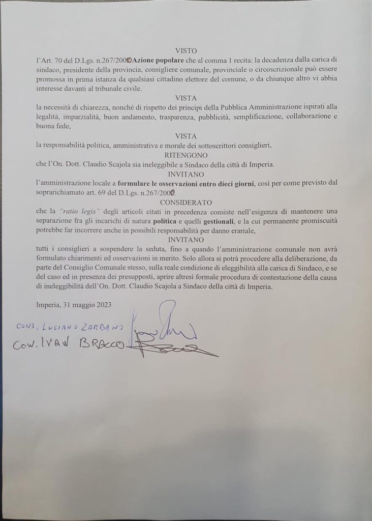 I sottoscritti consiglieri comunali Luciano Zarbano e Ivan Bracco, visti gli articoli in materia che prevedono che l’incarico di Commissario ad acta è inconferibile e incompatibile con il ruolo di Sindaco, ritengono che l’on. Claudio Scajola sia ineleggibile a Sindaco della città di Imperia e invitiamo l’amministrazione locale a formulare le osservazioni entro 10 giorni e a sospendere la seduta fino a che l’amministrazione non avrà formulato chiarimenti alle osservazioni in merito”.