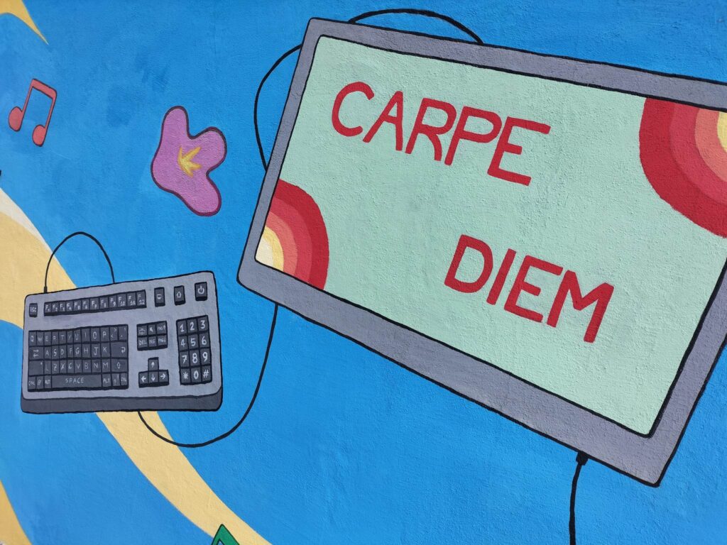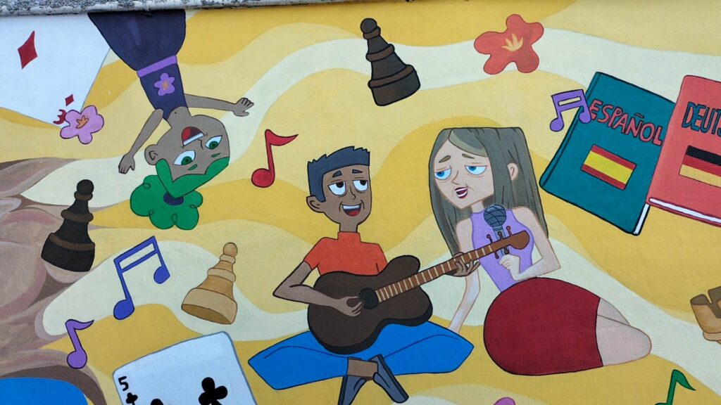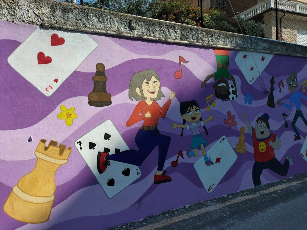 Questo murales fa vedere tutte le attività che ci sono al Carpe Diem. Ballano, giocano a scacchi, bridge, carte, fanno ginnastica, yoga, suonano. Un momento bellissimo e un posto bellissimo.