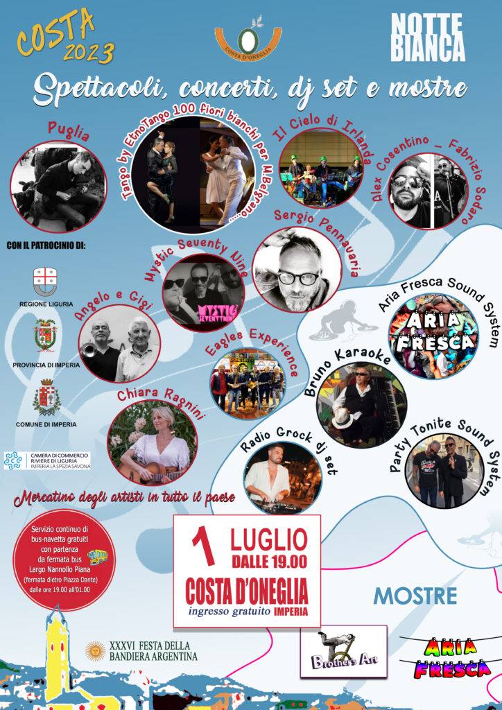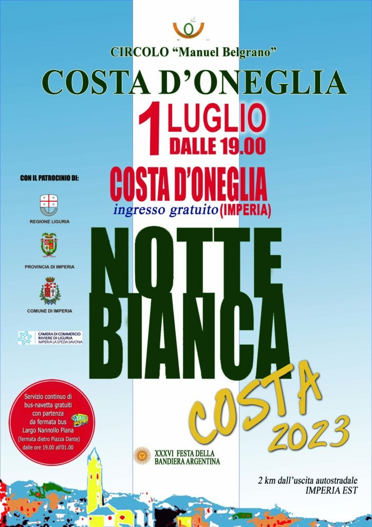 Sabato 1 luglio è in programma la “Notte Bianca Costa 2023” e la XXXVI Festa della Bandiera Argentina, organizzate dal Circolo Culturale Manuel Belgrano di Costa d’Oneglia (IM). Un parterre di spettacoli: Tango, 8 concerti live, 4 dj set fino a tarda notte, mostre, ristoranti e prelibatezze gastronomiche per tutti i gusti, banchetti. Tutti gli spettacoli sono gratuiti.