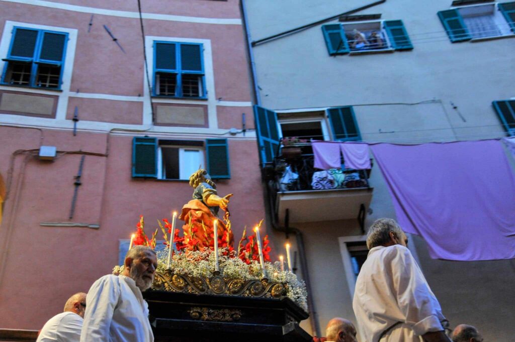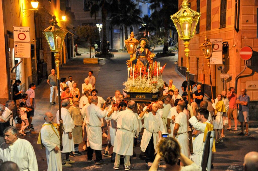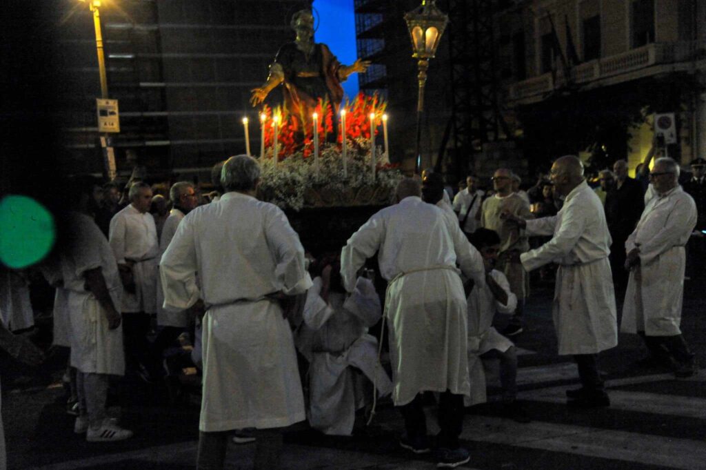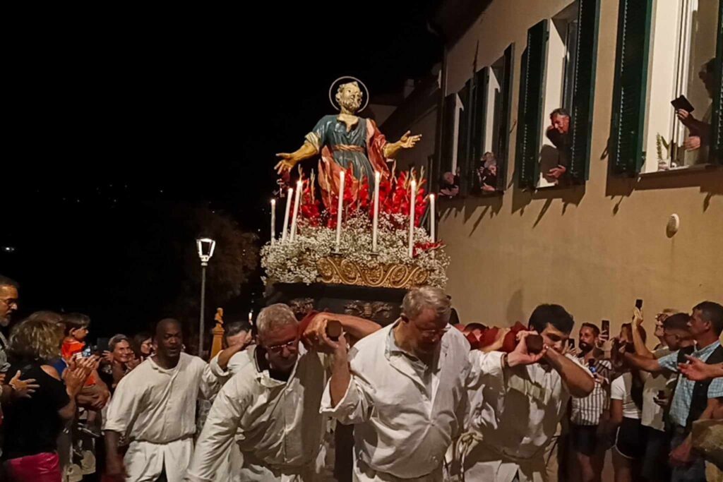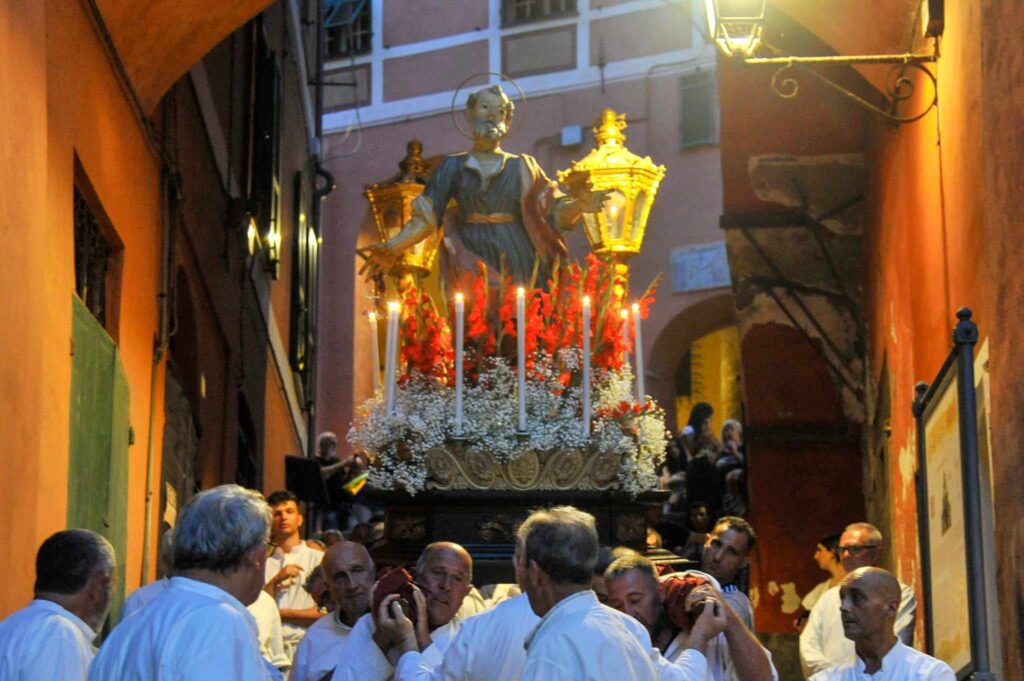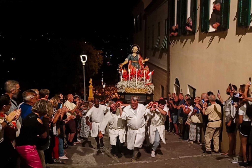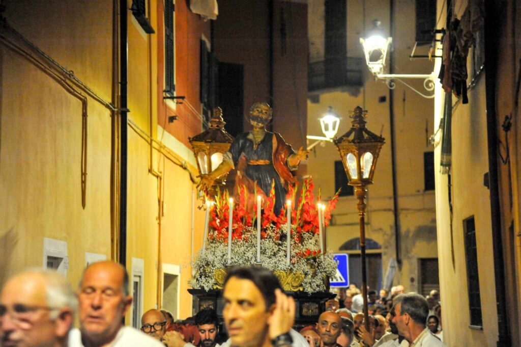 In chiusura si è assistito alla spettacolare corsa (“volata della cassa”) con la statua di San Pietro lungo la scalinata che porta all’Oratorio. Prima dell’ingresso, l’inchino della statua davanti al mare.
