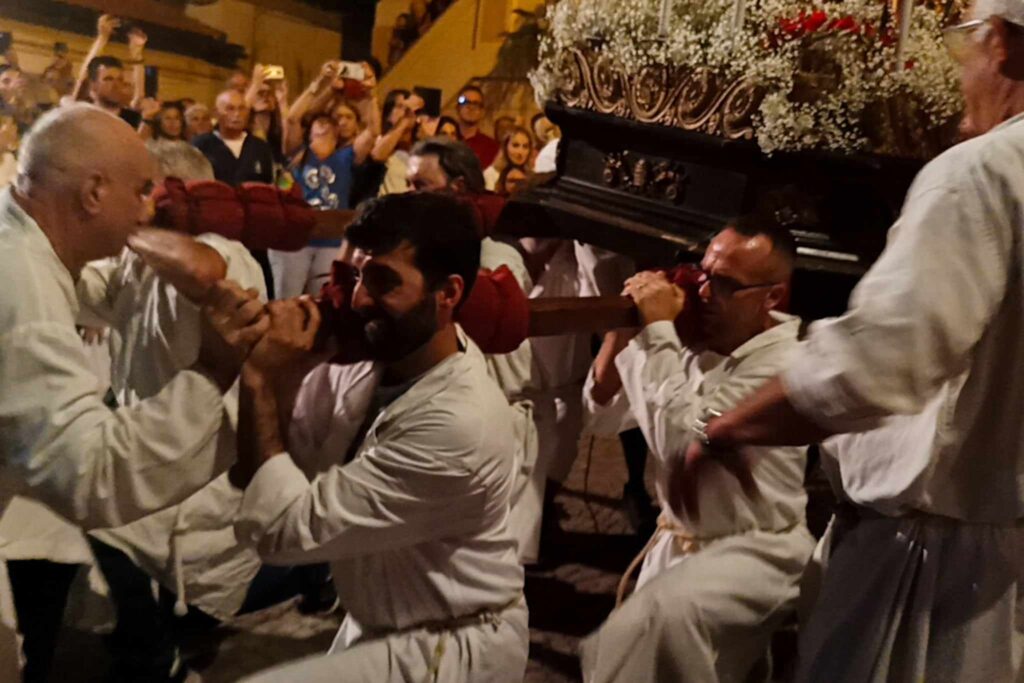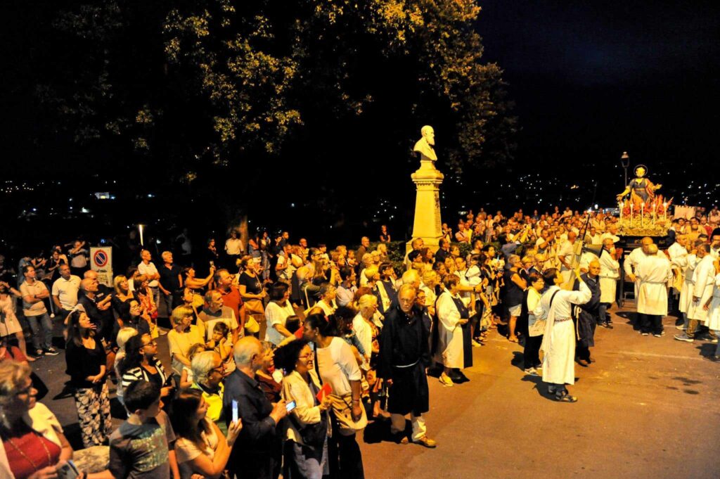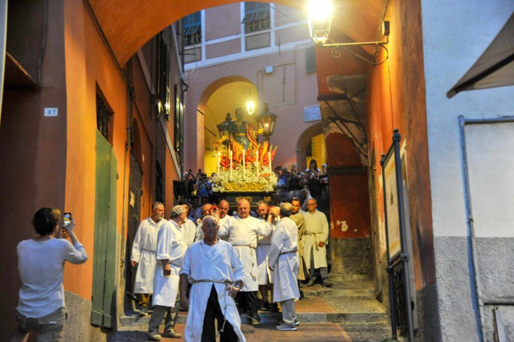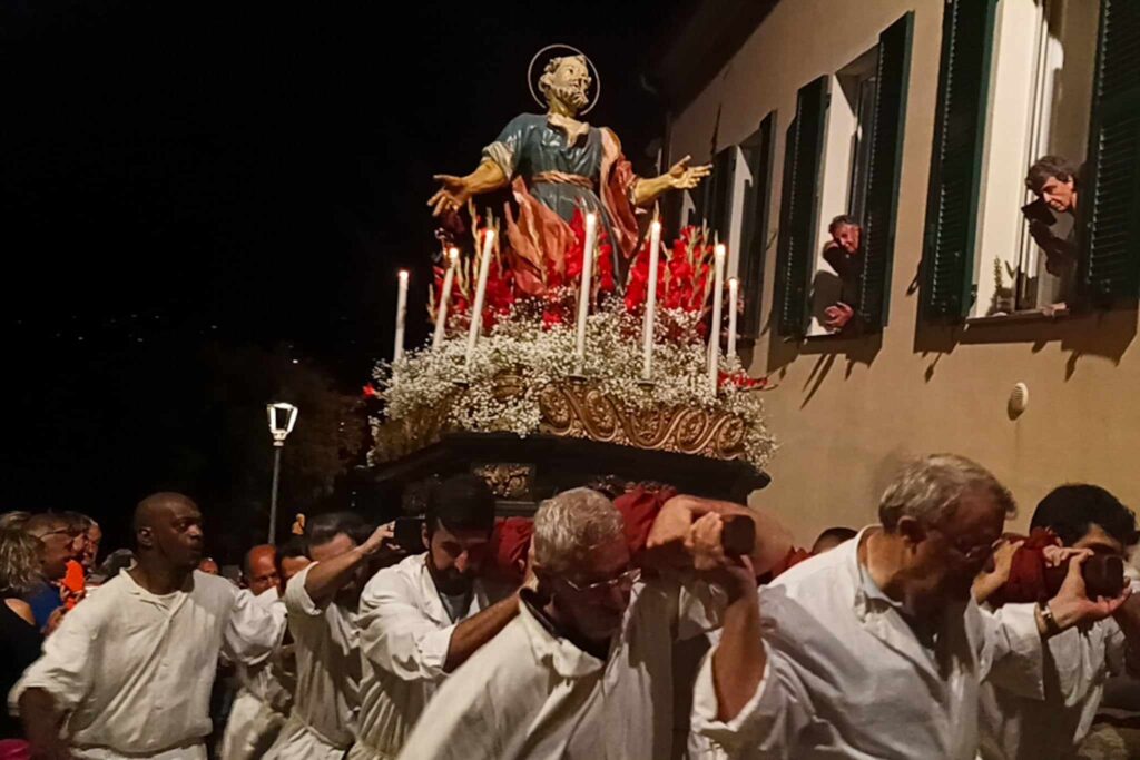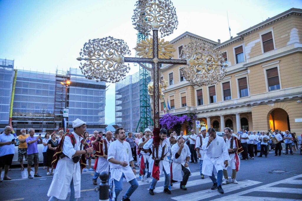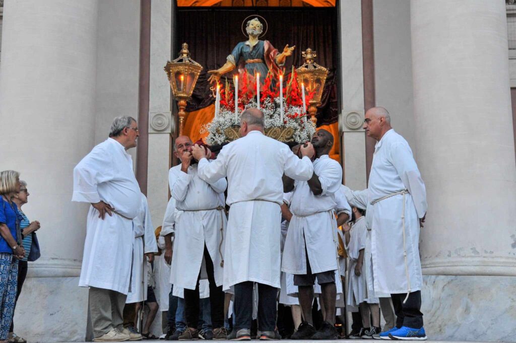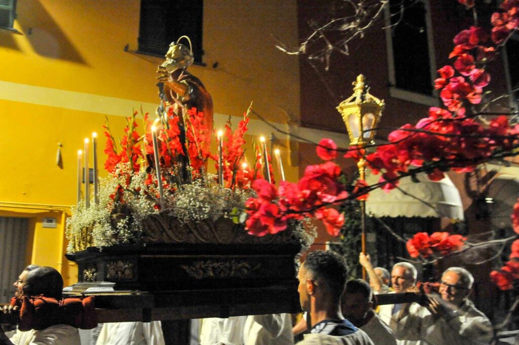 In chiusura si è assistito alla spettacolare corsa (“volata della cassa”) con la statua di San Pietro lungo la scalinata che porta all’Oratorio. Prima dell’ingresso, l’inchino della statua davanti al mare.