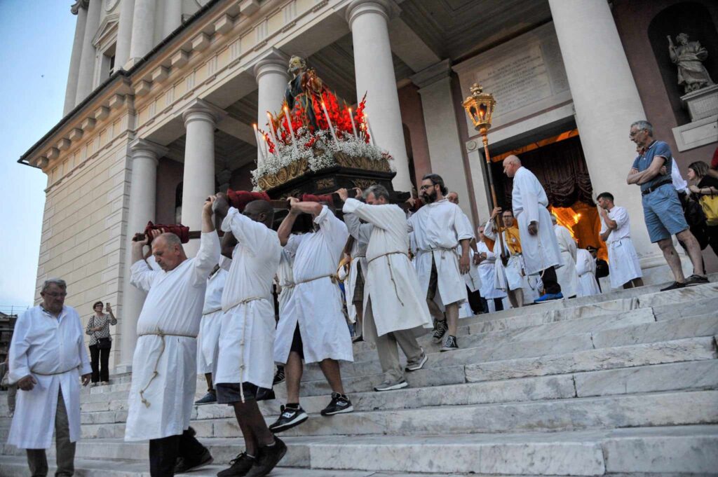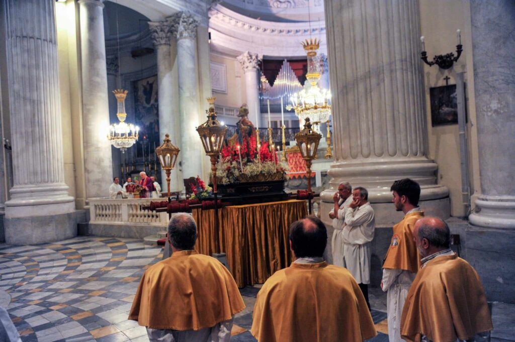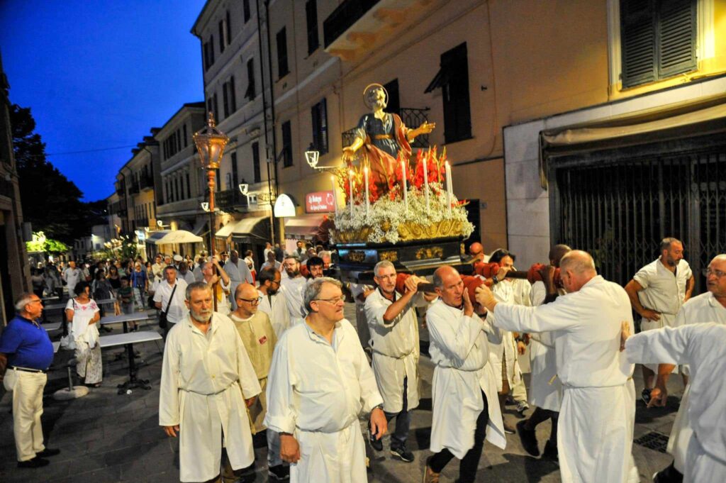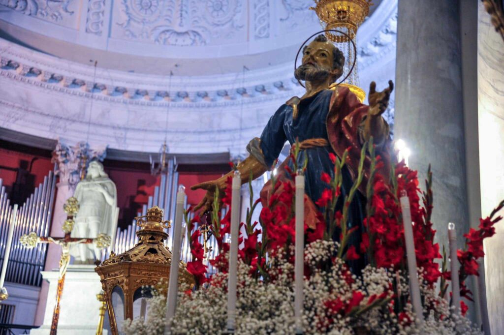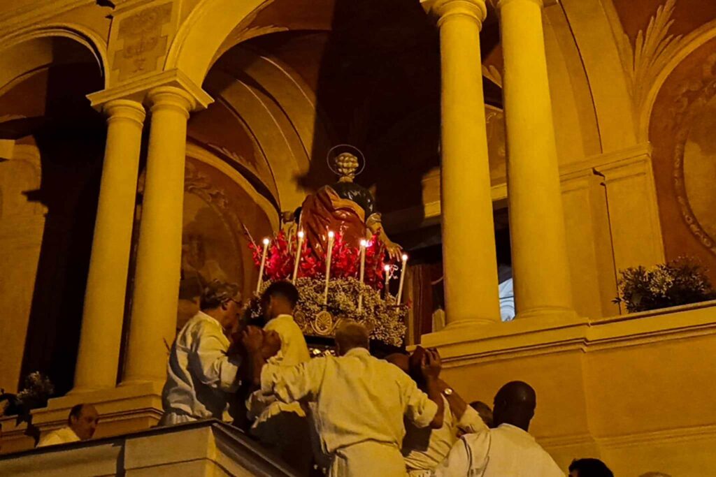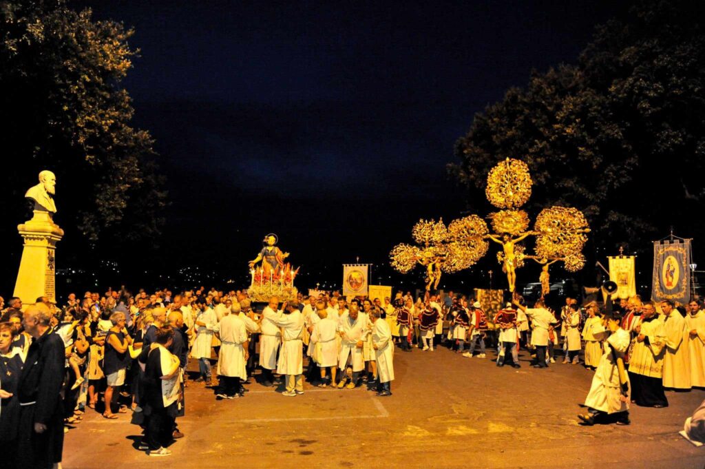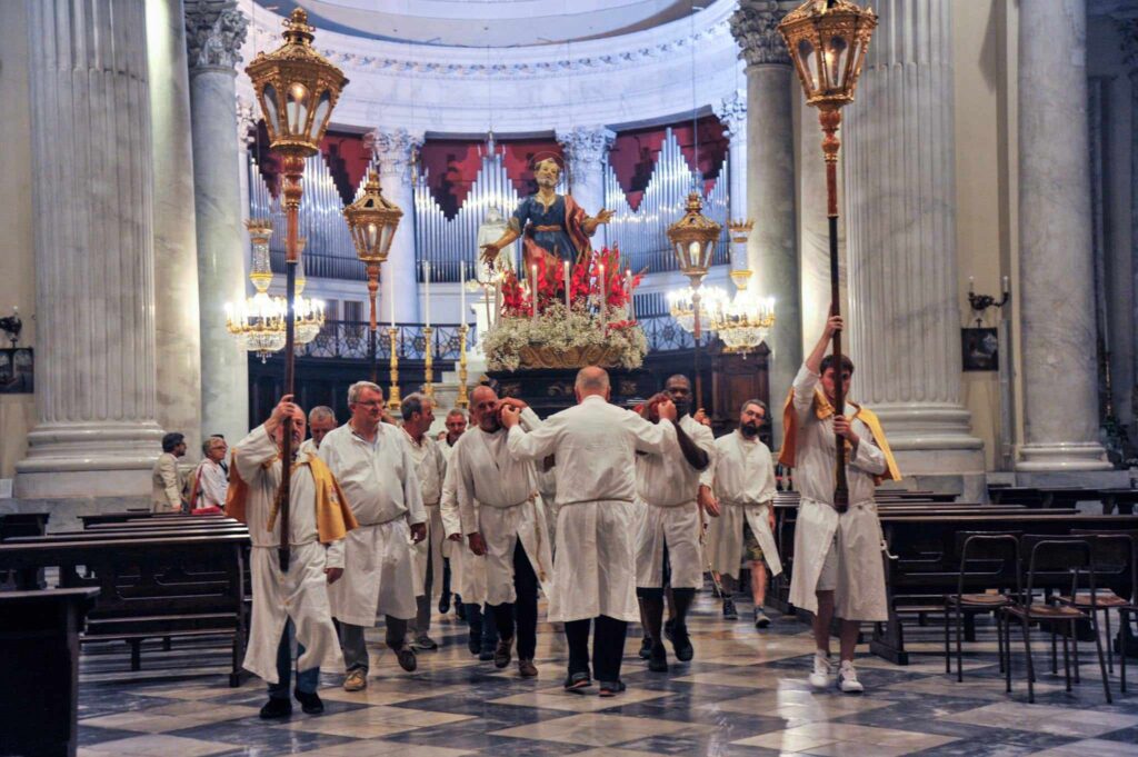 In chiusura si è assistito alla spettacolare corsa (“volata della cassa”) con la statua di San Pietro lungo la scalinata che porta all’Oratorio. Prima dell’ingresso, l’inchino della statua davanti al mare.