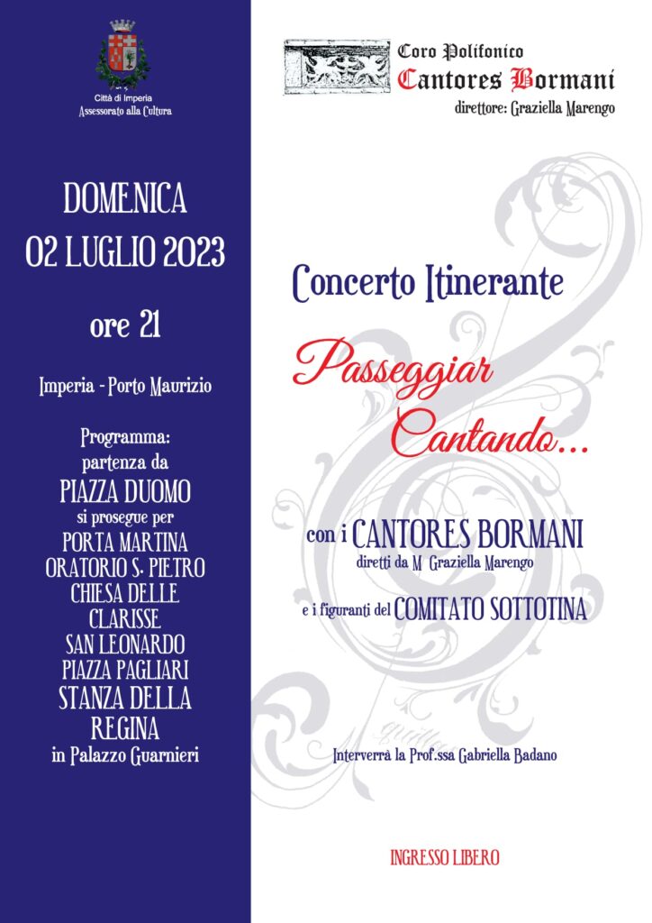 Domani, domenica 2 luglio, a partire dalle 21,00, a Porto Maurizio, è in programma il Concerto itinerante “Passeggiar cantando”, con i Cantores Bormani diretti da Graziella Marengo e i figuranti del Comitato Sottotina. Interverrà la professoressa Gabriella Badano.