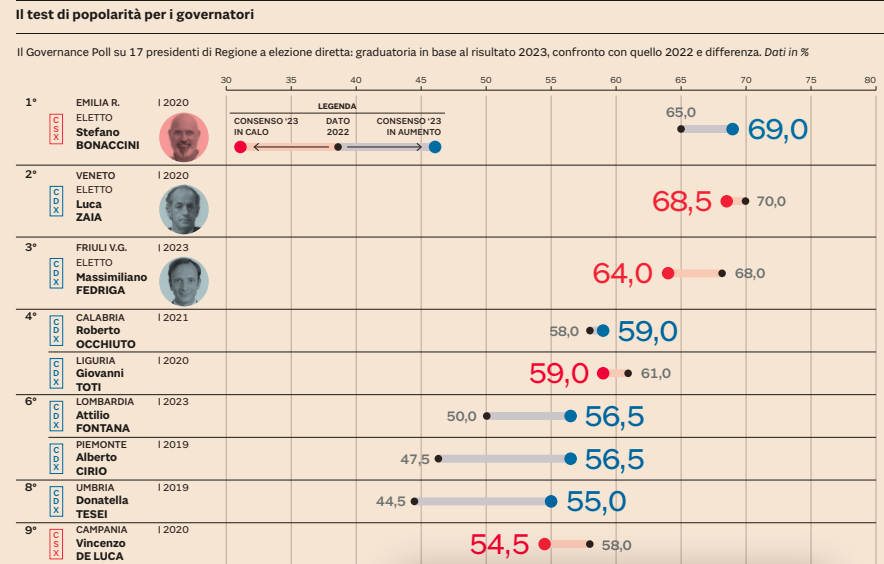 Il primo posto della classifica per l’anno 2023 è andato a Stefano Bonaccini, presidente dell’Emilia Romagna. La regione è recentemente balzata agli onori della cronaca di tutte le principali testate nazioni per via della tremenda alluvione che ha messo in ginocchio il territorio. Al secondo posto il Governatore del Veneto, Luca Zaia e al terzo posto Massimiliano Fedriga, presidente del Friuli Venezia Giulia.