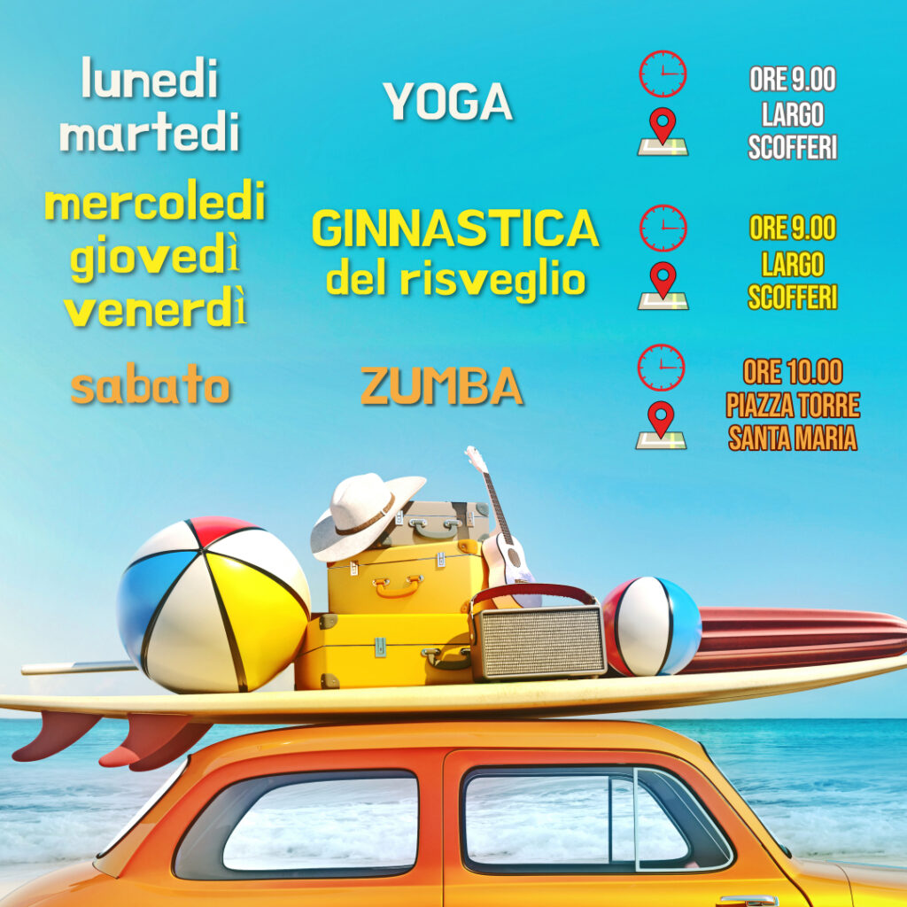 Il sabato in Piazza Torre Santa Maria è invece dedicato alla zumba, dove Arsenio Turro Carbonell aspetta turisti e residenti alle 10:30. Non occorre la prenotazione, basta presentarsi sul posto muniti di asciugamano, scorta d’acqua e tappetino.