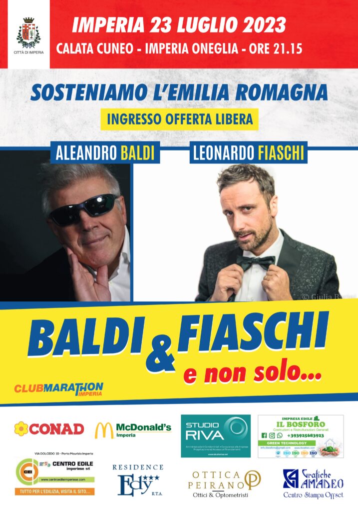 L’appuntamento è per domenica 23 luglio, alle ore 21.15, in Calata Cuneo a Imperia. “Baldi & Fiaschi e non solo…“, questo il titolo della serata che vedrà protagonisti Aleandro Baldi, cantautore cieco dalla nascita e Leonardo Fiaschi, imitatore e cabarettista italiano.