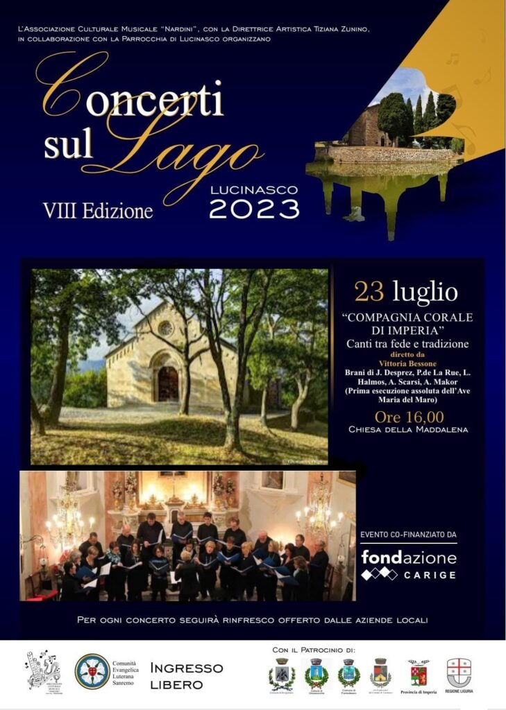 La Compagnia corale di Imperia, domenica 23 luglio, nella magnifica cornice della Chiesa della Maddalena di Lucinasco, alle ore 16:00, presenta un programma di musica vocale a cappella che propone canti polifonici sacri, antichi e contemporanei, insieme a canti popolari liguri.
