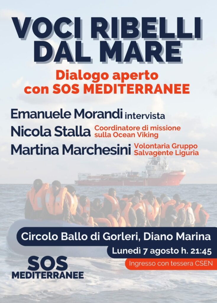 “Voci Ribelli dal Mare”, questo il titolo dell’incontro in programma lunedì 7 agosto, alle ore 21.45, presso il Circolo Ballo di Gorleri. L’appuntamento, ingresso con tessera CSEN, vede un dialogo aperto con la “Sos Mediterranee”.