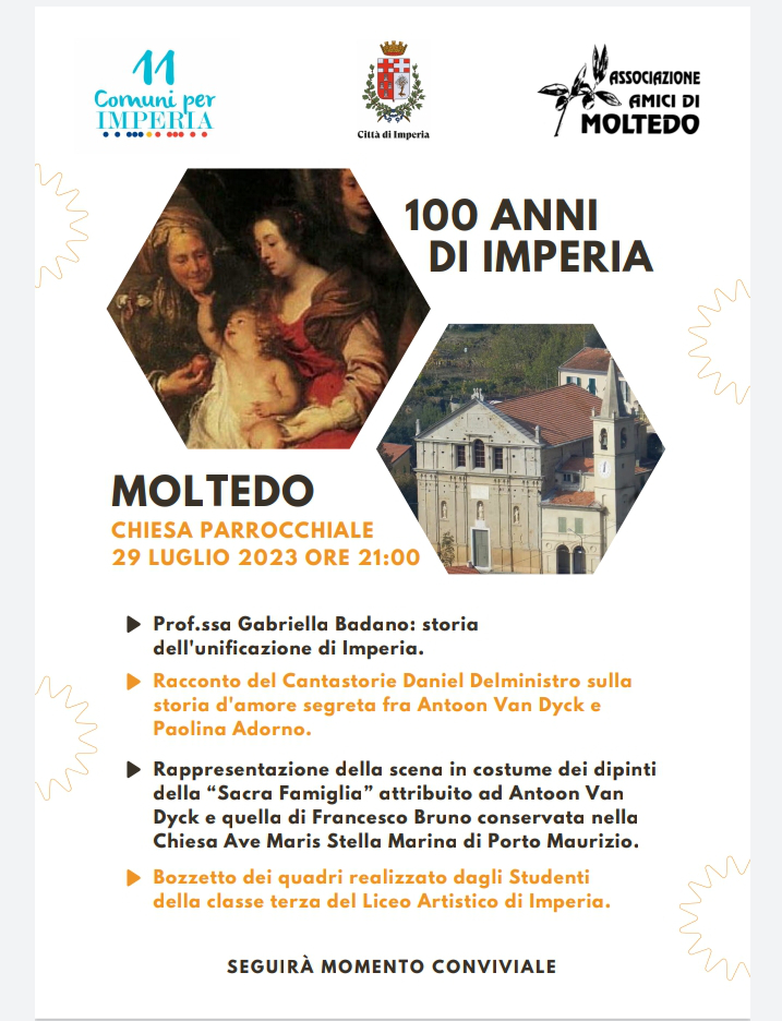 La Associazione Amici di Moltedo, col patrocinio dell’Amministrazione Comunale e con gli 11 Comuni per Imperia, ci invita ad una serata nello splendido borgo, sabato 29 prossimo, alle ore 21,00 nella chiesa parrocchiale.