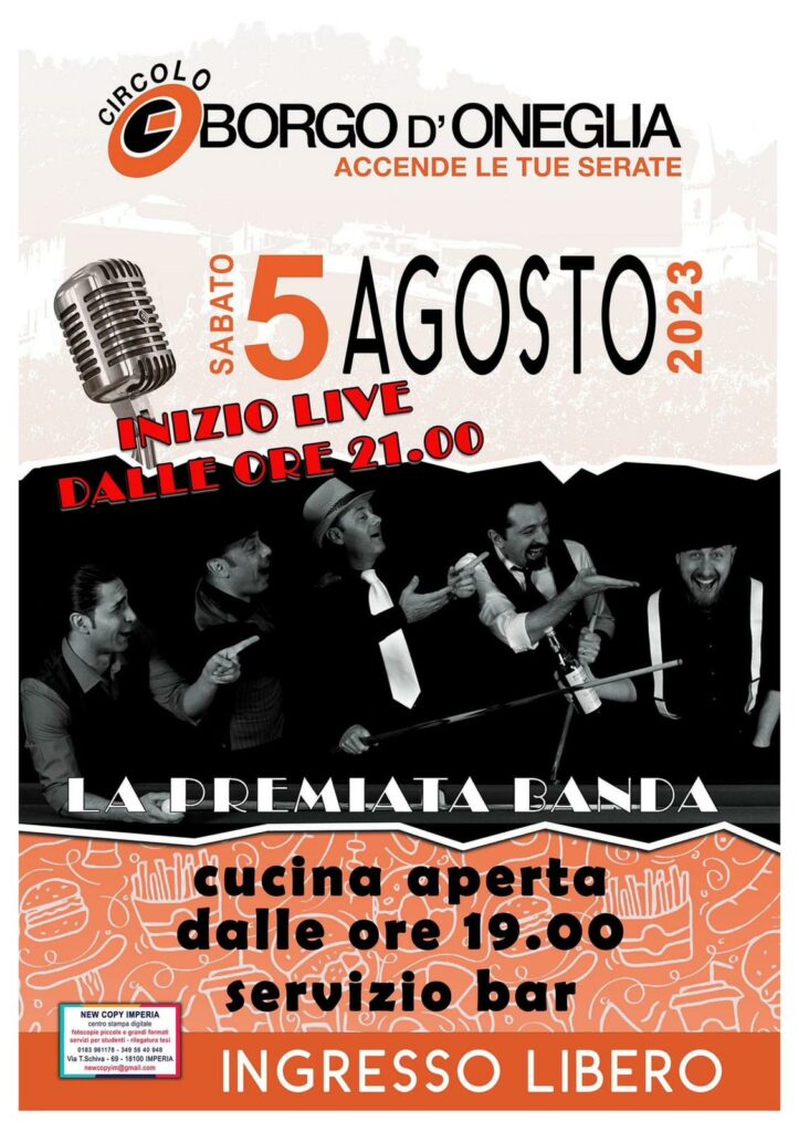 Nuovo appuntamento con la musica su iniziativa del Circolo Borgo d’Oneglia. Sabato 5 agosto dalle 21,00 si esibirà live La Premiata Banda, con ingresso libero.