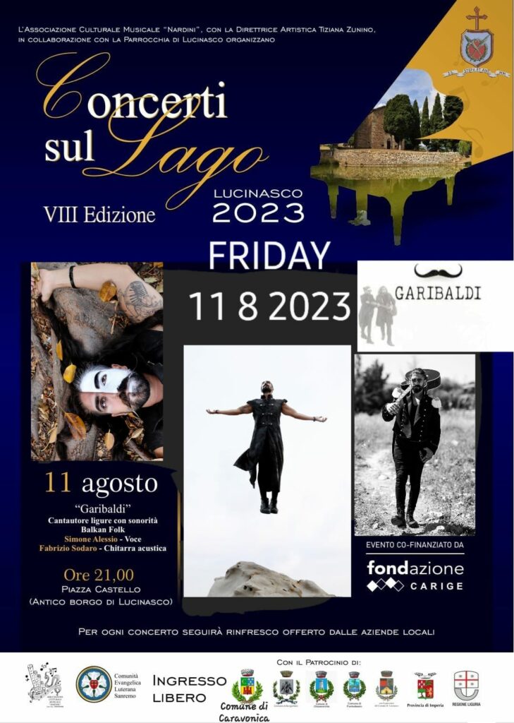 Venerdì 11 agosto Garibaldi sarà tra i protagonisti della rassegna “Concerti sul Lago”. Garibaldi, nome d’arte di Simone Alessio, poliedrico cantautore dianese con sonorità Balkan Folk, prodotto dal Maestro Umberto Iervolino, produttore di Renga, Grignani, Alexia e direttore d’orchestra di 26 Festival di Sanremo.