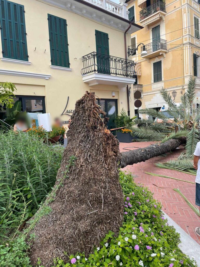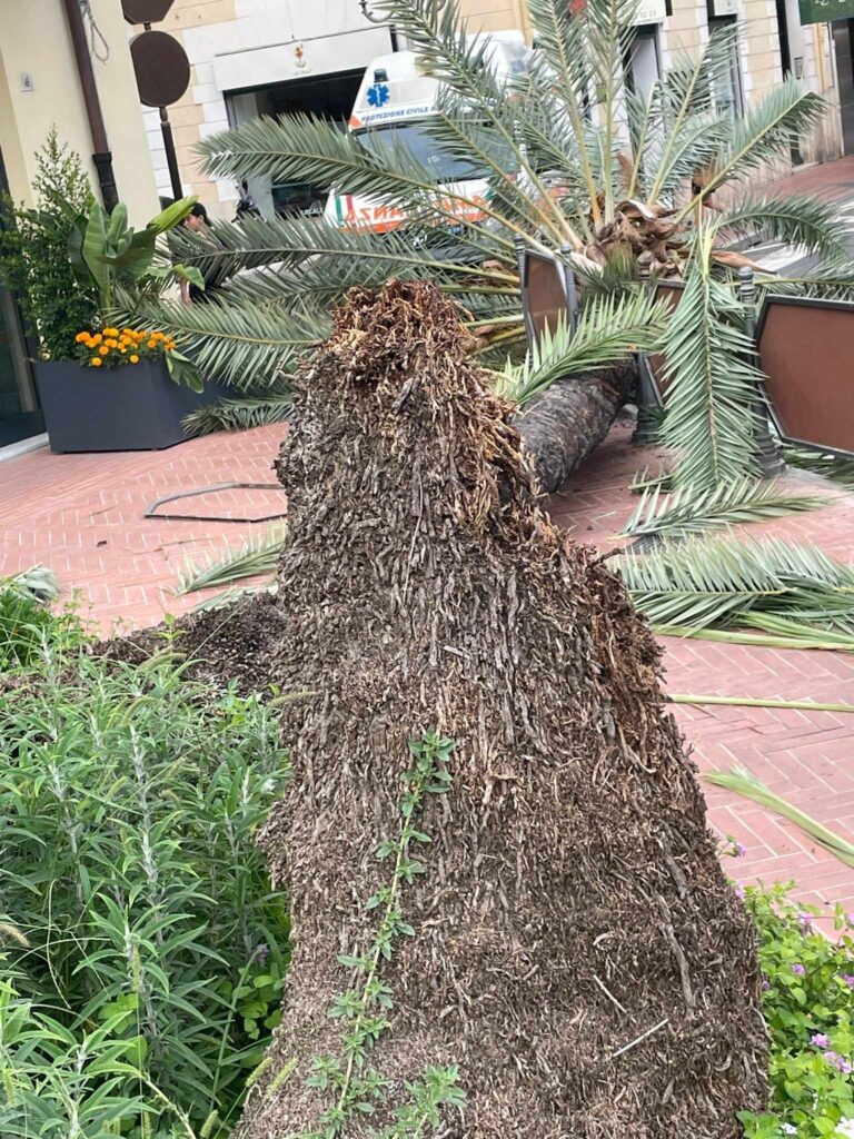 “S’è sentito un forte rumore – racconta una testimone – Neanche il tempo di capire cosa stesse succedendo e l’abbiamo vista crollare. Eravamo ad ascoltare i suonatori di bongo in piazza Ruffini quando la palma è caduta. Una signora è stata davvero miracolata. Si è riparata la testa con le braccia e si è spostata di un passo. E’ rimasta in mezzo tra il tronco della palma e le foglie. Poteva andare molto peggio”.