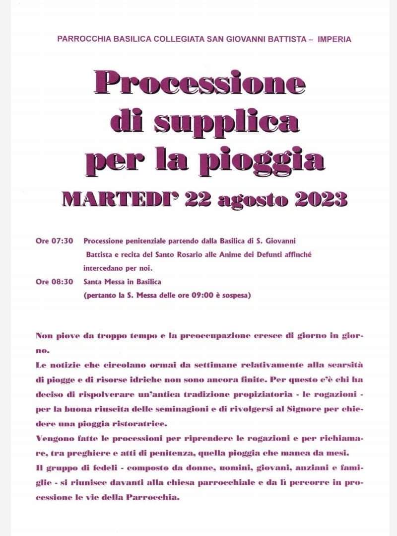 “Processione di supplica per la pioggia”. Si svolgerà anche quest’anno l’iniziativa promossa dal parroco della parrocchia della Basilica Collegiata di San Giovanni Battista, a Oneglia, Don Alessandro Ferrua,
