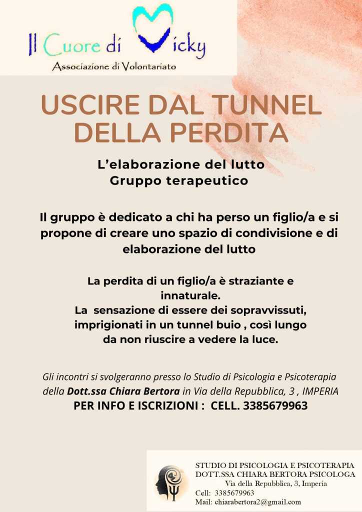 “Uscire dal tunnel della perdita” – Questo il titolo del gruppo terapeutico, organizzato dall’associazione volontariato “Il Cuore di Viky”, dedicato a chi ha perso un figlio/a. L’iniziativa è volta a creare uno spazio di condivisione e di elaborazione del lutto che possa essere accessibile a tutti.