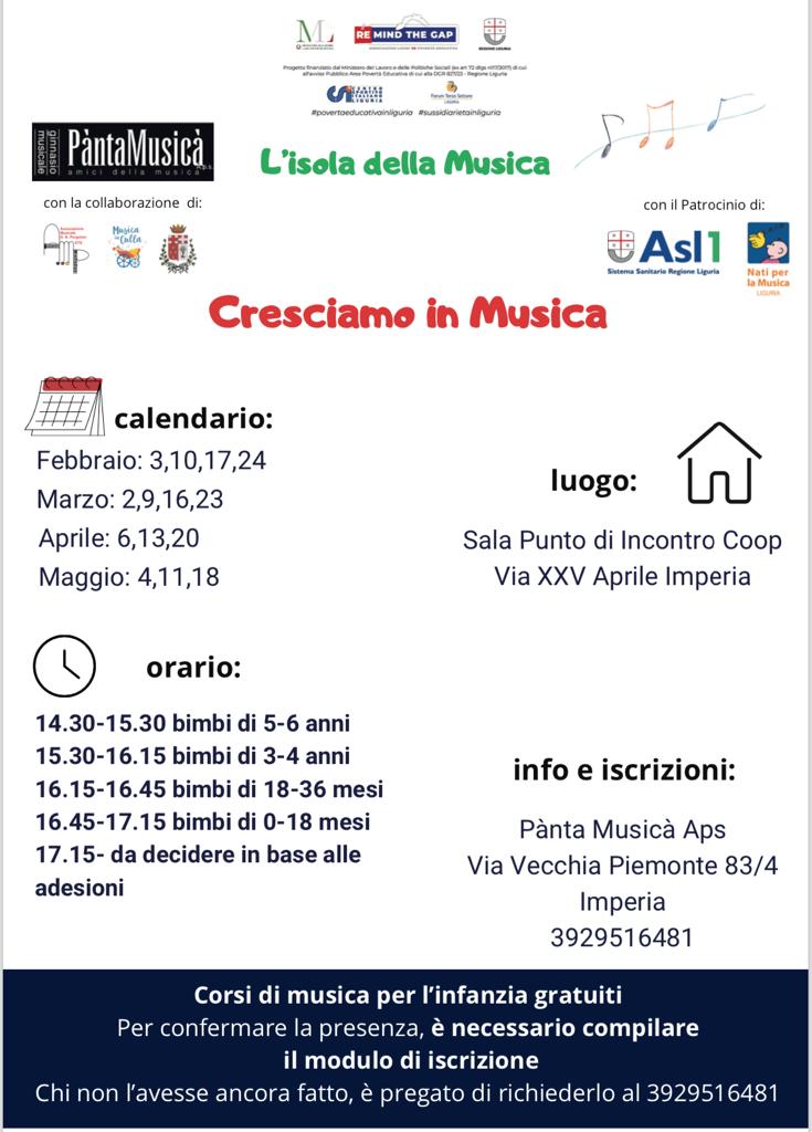 Il corso è promosso dal progetto “L’Isola della Musica”, organizzato da Pànta Musicà APS in collaborazione con il Comune di Imperia, finanziato dalla Regione Liguria e con il patrocinio dell’Asl 1 e Nati per la Musica.