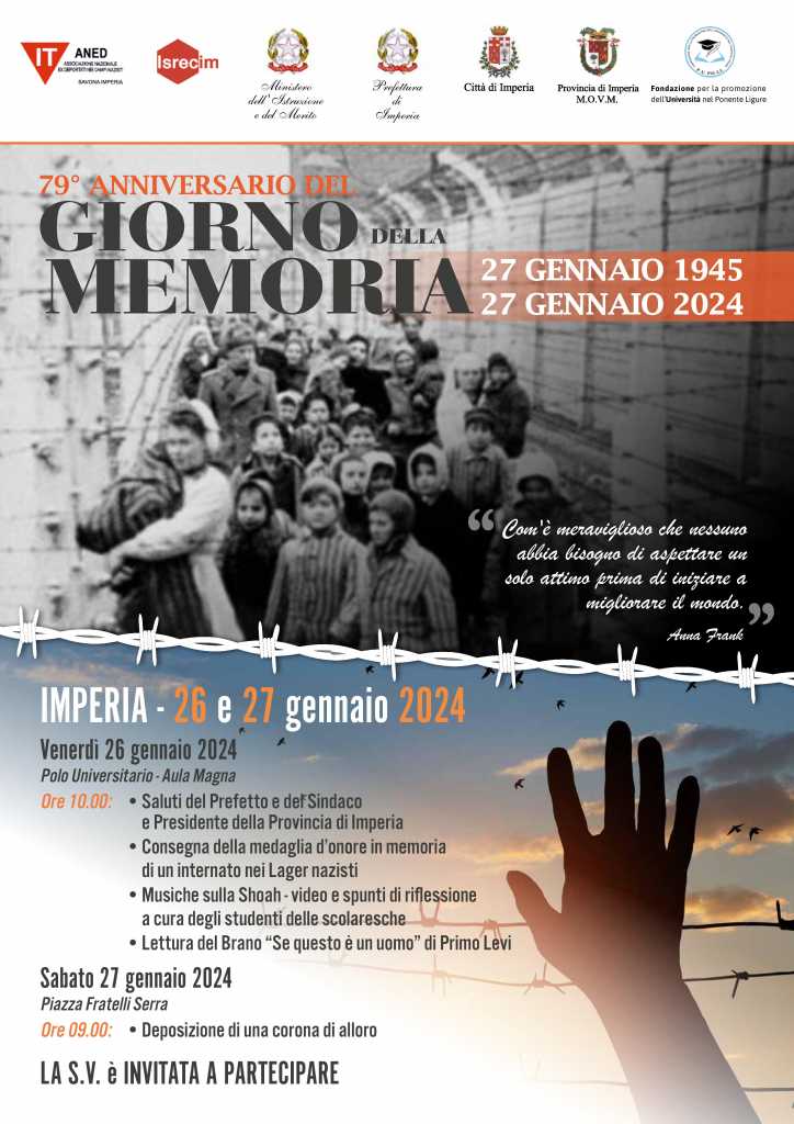 Venerdì 26 gennaio alle ore 10.00, presso l’Aula Magna del Polo Universitario di Imperia, si terrà una Cerimonia, alla presenza delle Autorità civili, militari e religiose, rivolta soprattutto ai giovani e organizzata con il contributo del Comune di Imperia, della Provincia, dell’Ufficio Scolastico Provinciale, dell’Associazione Nazionale Ex Deportati di Savona e Imperia e dell’ISRECIM.
