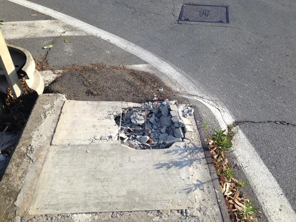 Oggi, 22 settembre, la situazione della messa in sicurezza della ringhiera sfondata è praticamente invariata rispetto ai giorni subito successivi all’incidente: un nastro di plastica bianco e rosso e una saldatura abbastanza approssimativa dovrebbe tenere insieme le due parti della ringhiera.