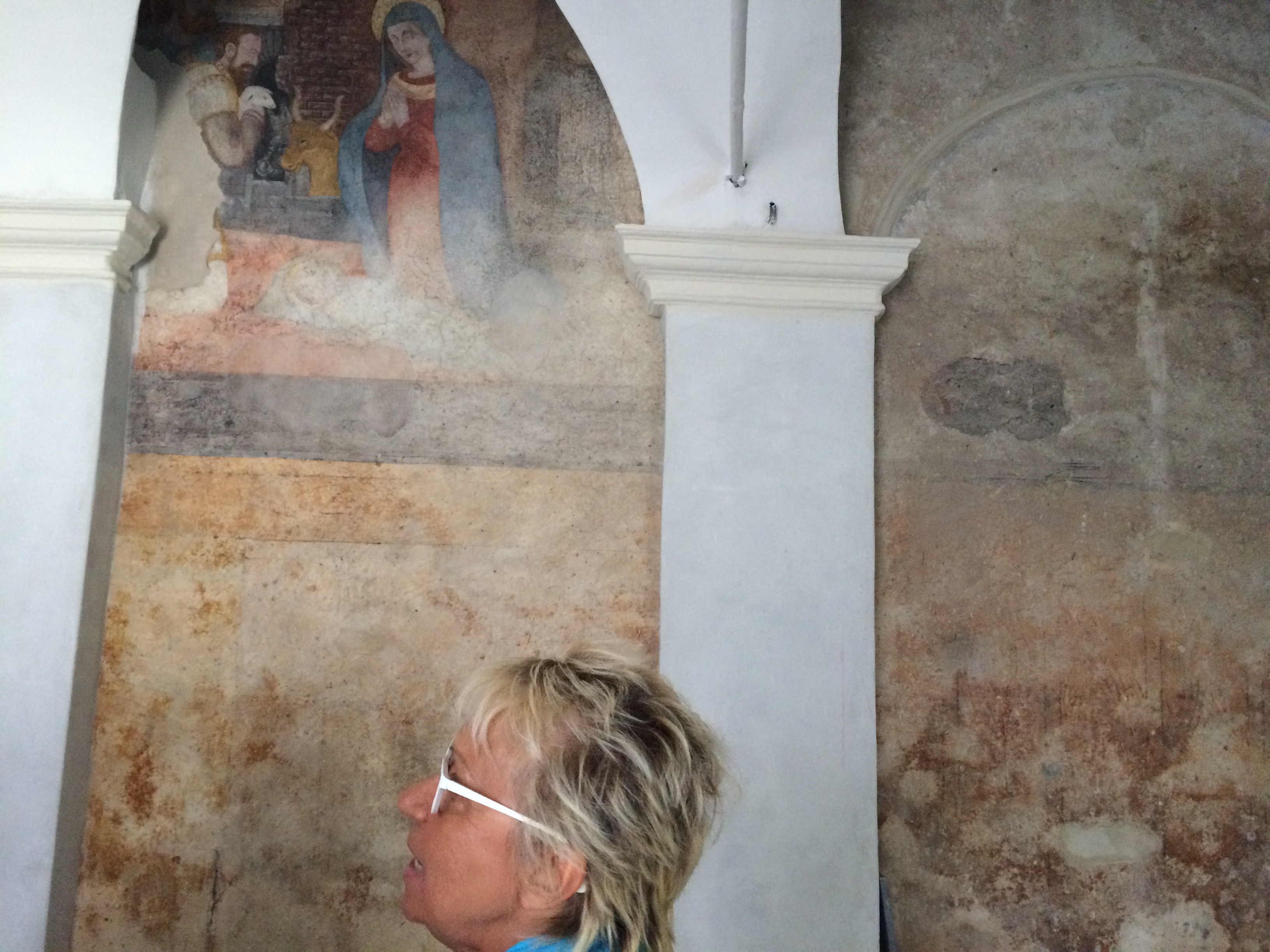“Abbiamo portato alla luce già 4 o 5 anni fa un brano di un affresco che poi si è rivelato essere importantissimo, perché è di Francesco Brea, del 1541, e che a carico della sovrintendenza è stato restaurato. Sono state trovate altre tracce di affreschi che solo ora abbiamo potuto rinvenire nella loro totalità e nel loro splendore, perché erano nascosti sotto una volta. Quindi io andando a fare la speleologa, archeologa, architetto sotto le volte, ho visto dei brani di affresco che mi incuriosivano, abbiamo tirato giù quel pezzo di volta, di cannicci naturalmente, quindi senza nessun problema e abbiamo trovato questi affreschi che probabilmente sono del ’400, orientativamente. Non abbiamo ancora potuto attribuirli, forse fratelli Biasacci, forse scuola di Antonio da Montelegale e che comunque sono parzialmente visibili e hanno una loro lucentezza a livello di colore, perché sono rimasti nascosti sotto le volte, quindi nessuno ha potuto manometterli. C’è una bella figura di Zaccaria, che diciamo è il clou di questo ritrovamento e probabilmente andando a scavare vicino sotto alle altre volte troveremo ancora qualcosa.