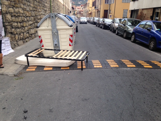 Imperia. Un nostro lettore ci ha segnalato una situazione di estremo degrado nel cuore della nostra città. Siamo in via Santa Lucia e, proprio in mezzo alla strada, sopra un dosso per ridurre la velocità degli automobilisti, è stata abbandonata la struttura di un letto con le doghe e tanto di materasso.