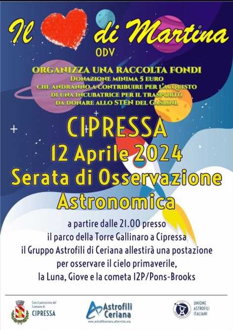 L’appuntamento, promosso dal gruppo Astrofili di Ceriana, sarà occasione per aiutare l’associazione “Il Cuore di Martina“ nell’acquisto di un’incubatrice specificamente progettata per il trasporto neonatale e un modernissimo ventilatore polmonare per lo STEN del Gaslini.