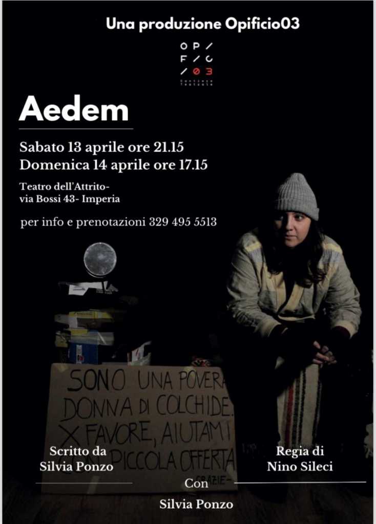 Sabato 13 aprile alle ore 21.15 e in replica domenica 14 alle ore 17.15 al Teatro dell’Attrito di Imperia, andrà in scena “Aedem“, spettacolo teatrale scritto e interpretato da Silvia Ponzo della compagnia Opificio 3 di Roma.