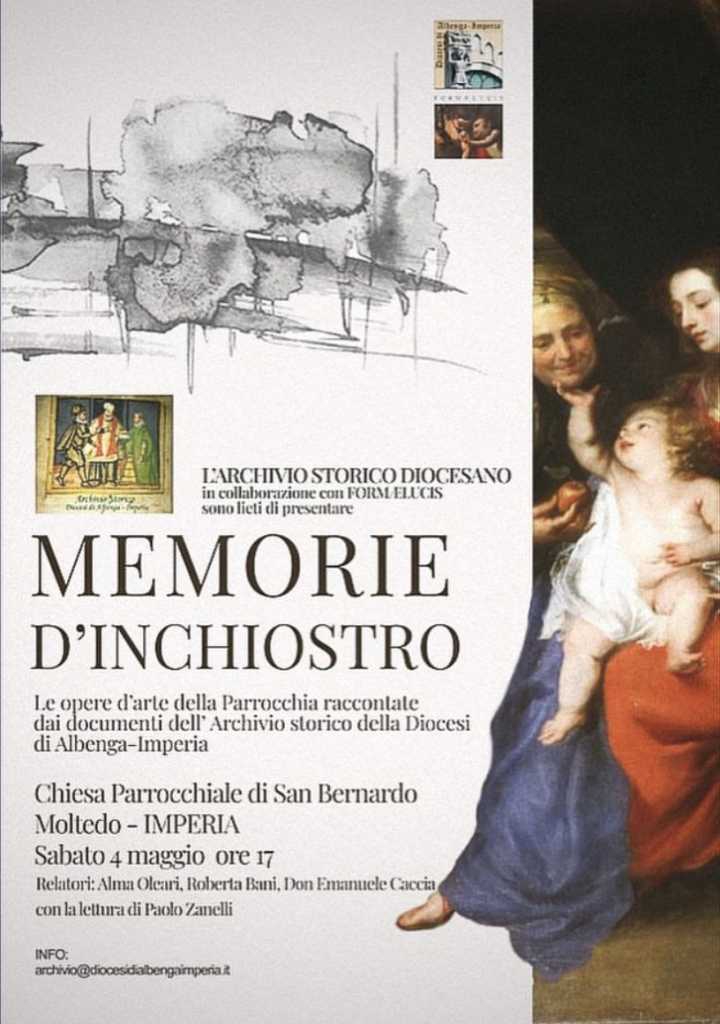Sabato 4 maggio alle ore 17:00, nella chiesa parrocchiale di San Bernardo Abate in Moltedo, l’Archivio storico diocesano diretto dalla dottoressa Alma Oleari, in collaborazione con Forme Lucis diretto dall’architetto Castore Sirimarco, presenterà “MEMORIE D’INCHIOSTRO” : i documenti dell’Archivio storico della diocesi di Albenga-Imperia raccontano le opere d’arte della Parrocchia di San Bernardo abate.