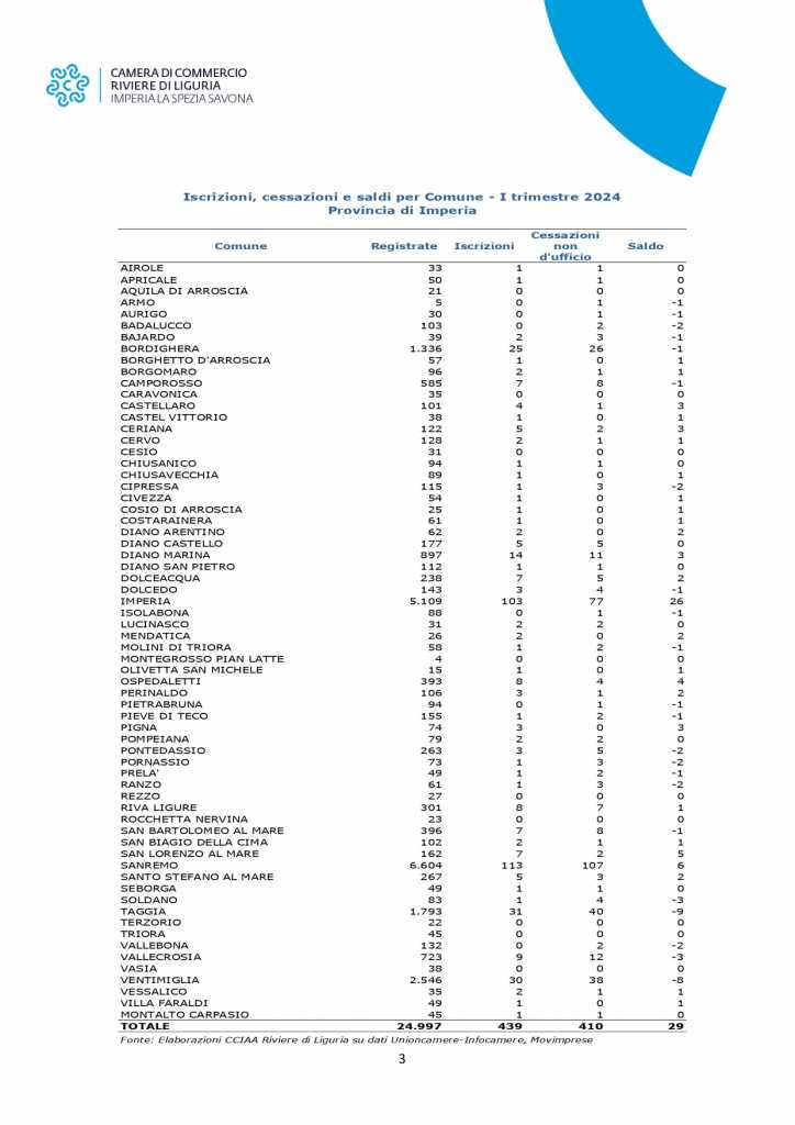 Nel primo trimestre dell’anno, torna su livelli positivi la demografia delle imprese nella provincia di Imperia. Questo il dato più saliente che scaturisce dall’analisi della Camera di Commercio Riviere di Liguria sui dati Movimprese che fotografa l’andamento demografico delle imprese nel primo trimestre 2024.