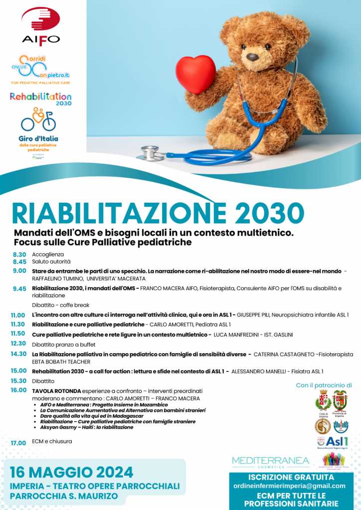 Questo Convegno è frutto di un’efficace sinergia tra gli intenti dell’OMS e della Fondazione Marruzza. AIFO Imperia e Sorridiconpietro, con la Direzione Tecnico-Scientifica del Dr. Carlo Amoretti, pediatra Asl1 offrono una formazione che risponde appieno alla “Call for action” della Rehabilitation 2030.
