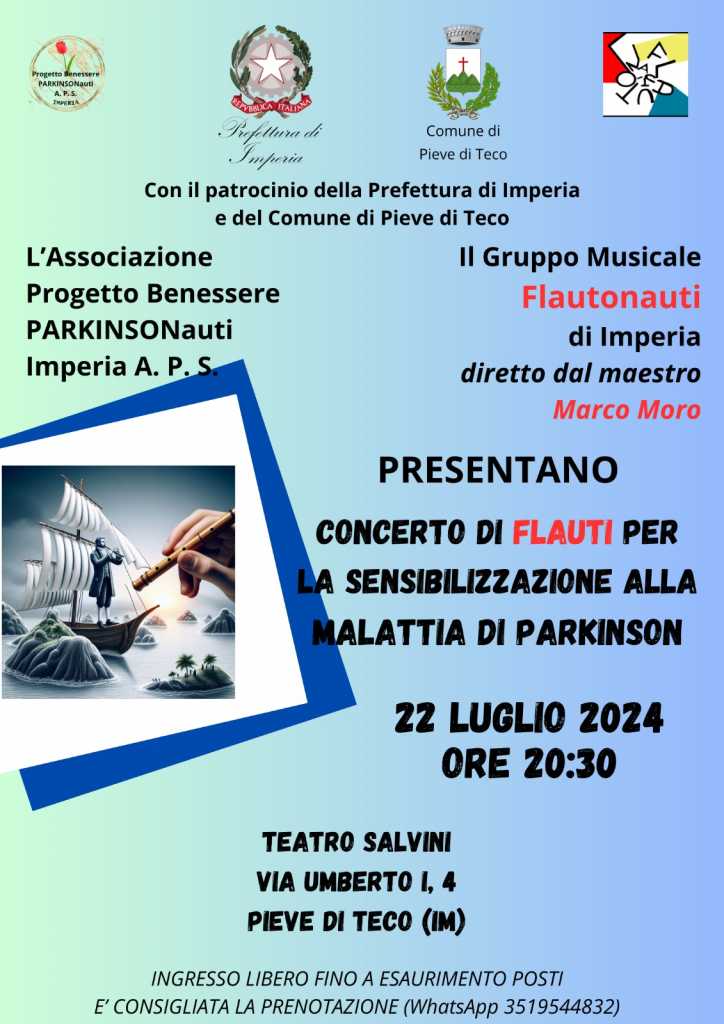 L’associazione Progetto Benessere Parkinsonauti Aps di Imperia, con il patrocinio della Prefettura di Imperia e del Comune di Pieve di Teco, e la collaborazione del gruppo musicale Flautonauti di Imperia, diretta dal Maestro Marco Moro, presentano un concerto di flauti per la sensibilizzazione alla malattia di Parkinson.