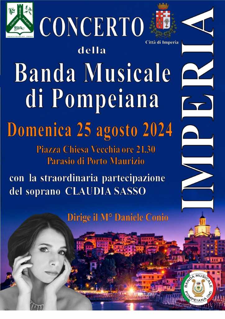 Il Circolo Parasio organizza per domenica 25 agosto 2024 alle ore 21,30 in Piazza Chiesa Vecchia (Parasio) il Concerto della Banda Musicale di Pompeiana. L’evento è ad ingresso libero e patrocinato dalla Città di Imperia.