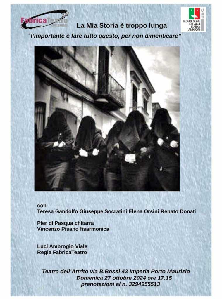 Domenica 27 ottobre alle ore 17.15 al Teatro dell’Attrito la Compagnia Fabricateatro porterà in scena lo spettacolo contro le mafie “La mia storia è troppo lunga “, con Teresa Gandolfo, Elena Orsini, Giuseppe Socratini, Renato Donati, Pier Di Pasqua e Vincenzo.