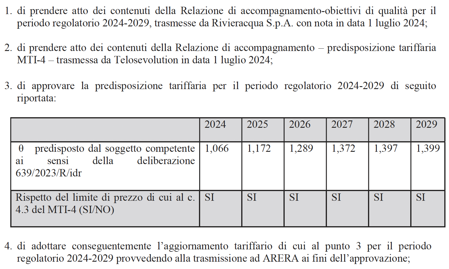 Si passerà dunque da 1,066 € al m3 del 2024 fino ad arrivare ai 1,399 € al m3 nel 2029. All’interno delle sei pagine del documento con oggetto “approvazione della predisposizione tariffaria mti–4 per il periodo 2024–2029 con adozione dell’aggiornamento tariffario ed approvazione dell’ aggiornamento…” si fa riferimento alla difficile situazione economica/debitoria di Rivieracqua e alla relazione di accompagnamento-obiettivi di qualità per il periodo 2024/2029 e del programma degli interventi e piano delle opere strategiche che la stessa ha presentato lo scorso 1 luglio al Commissario ad Acta.