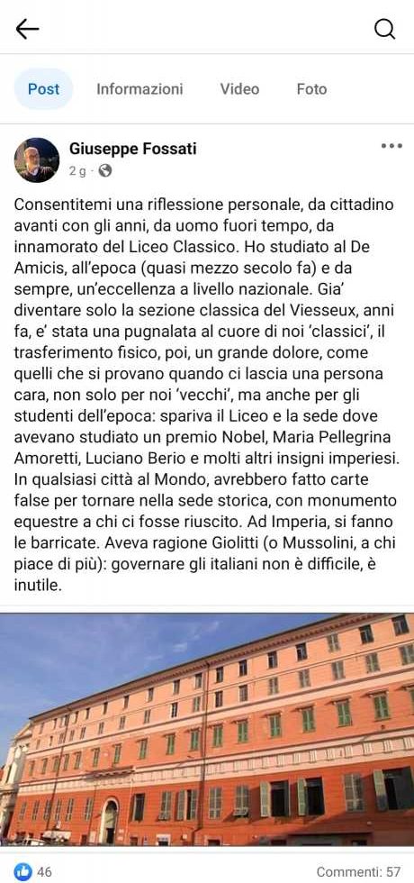 “Consentitemi una riflessione personale – si legge sulla pagina social del Vicesindaco di Imperia, Giuseppe Fossati – da cittadino avanti con gli anni, da uomo fuori tempo, da innamorato del Liceo Classico. Ho studiato al De Amicis, all’epoca (quasi mezzo secolo fa) e da sempre, un’eccellenza a livello nazionale. Gia’ diventare solo la sezione classica del Viesseux, anni fa, e’ stata una pugnalata al cuore di noi ‘classici’, il trasferimento fisico, poi, un grande dolore, come quelli che si provano quando ci lascia una persona cara, non solo per noi ‘vecchi’, ma anche per gli studenti dell’epoca: spariva il Liceo e la sede dove avevano studiato un premio Nobel, Maria Pellegrina Amoretti, Luciano Berio e molti altri insigni imperiesi.