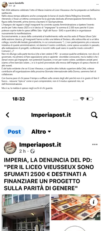 “Nel 2024 abbiamo celebrato l’otto di Marzo insieme al Liceo Vieusseux che ha preparato un bellissimo spettacolo. Nello stesso tempo abbiamo anche consegnato le borse di studio Maria Pellegrina Amoretti, ritenendo ci fosse un’ottima connessione tra la giornata dedicata all’emancipazione femminile e la figura della Amoretti, prima donna a laurearsi in Giurisprudenza“. Inizia così il lungo post pubblicato su Facebook dall’assessore Gandolfo per spiegare l’accaduto in merito alle accuse del Partito Democratico.