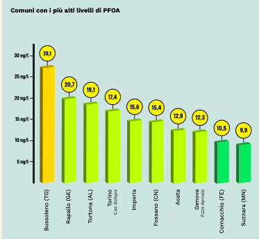 Preoccupante è la presenza del PFOA, di cui Imperia registra la quinta concentrazione più alta in Italia con 15,6 nanogrammi per litro. Si tratta di una delle molecole che appartiene al gruppo dei PFAS, ed è stata classificata come cancerogena. Al primo posto abbiamo Bussoleno (TO), seguita da Rapallo (GE), Tortona (AL) e Torino.