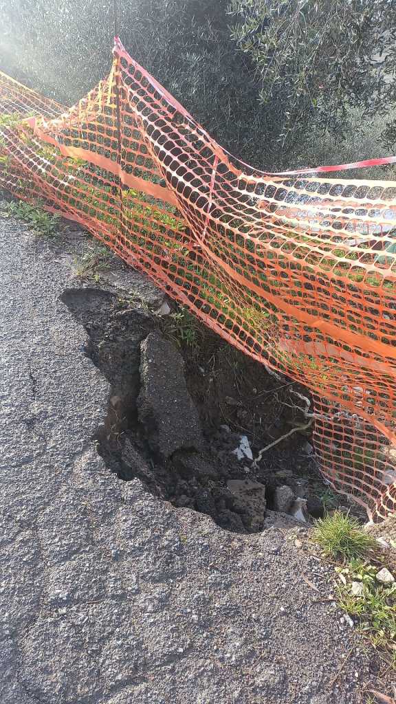 Dalle immagini si notano chiaramente crepe e voragini sul manto stradale e i residenti lamentano l’assenza di interventi risolutivi temendo ora l’isolamento, soprattutto in caso di ulteriori peggioramenti.