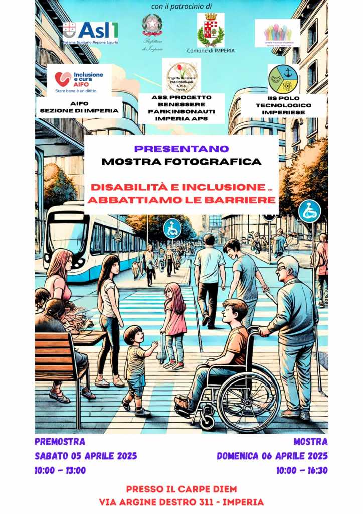 Imperia, 03/04/2025 – Nei giorni di sabato 5 aprile 2025, dalle 10:00 alle 13:00, e domenica 6 aprile 2025, dalle 10:00 alle 16:30, si terrà presso il Carpe Diem, in Via Argine Destro 311 a Imperia, la mostra fotografica dal titolo “Disabilità e inclusione … Abbattiamo le barriere”.