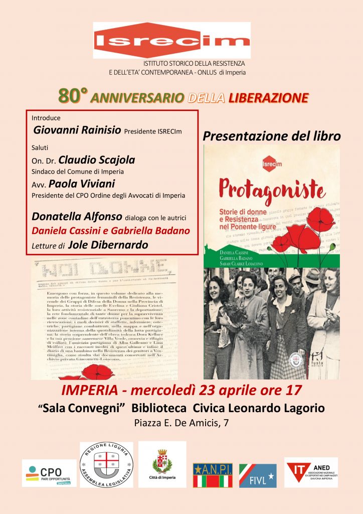 In occasione dell’ 80° Anniversario della Liberazione, l’Istituto Storico della Resistenza e dell’Età Contemporanea di Imperia presenta il nuovo libro, promosso insieme all’Assemblea legislativa della Regione Liguria , intitolato “Protagoniste. Storie di donne e Resistenza nel Ponente Ligure” scritto da Daniela Cassini, Gabriella Badano e Sarah Clarke Loiacono, Fusta Editore.