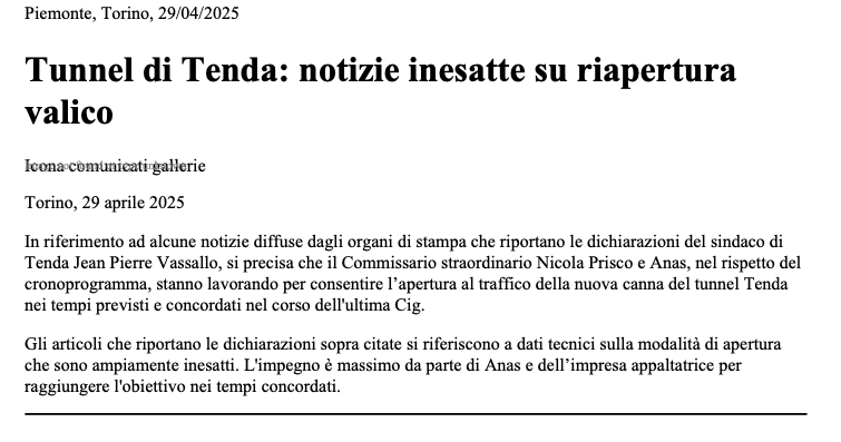 Il nuovo tunnel del Col di Tenda potrebbe riaprire entro il 30 giugno 2025. La notizia trova conferma nella recente precisazione di ANAS.