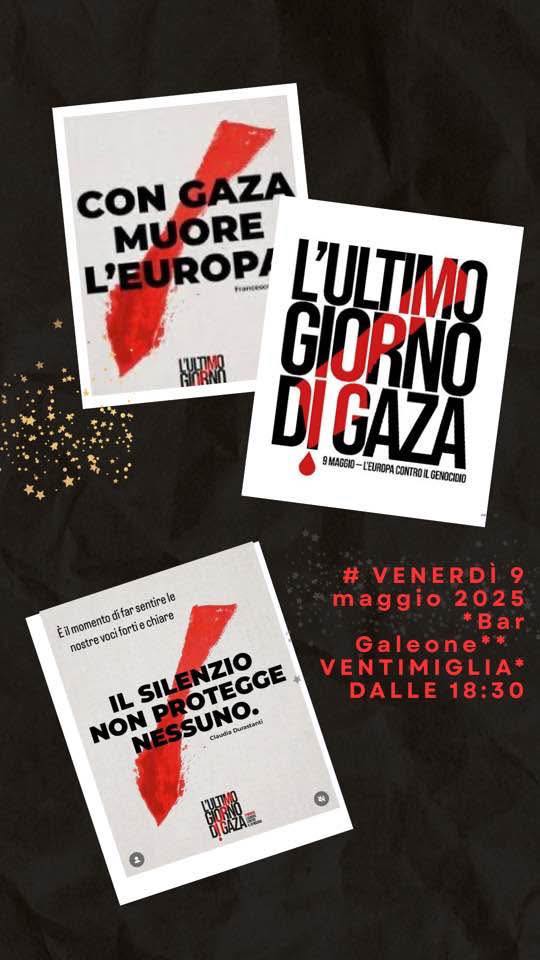 Si è svolta venerdì 9 maggio, al Bar Galeone di Ventimiglia, una mobilitazione in occasione della campagna europea “L’Ultimo Giorno di Gaza”, promossa in concomitanza con la Giornata dell’Europa. L’iniziativa, che ha avuto luogo anche in diverse città italiane ed europee, ha voluto richiamare l’attenzione sull’emergenza umanitaria in corso nella Striscia di Gaza.