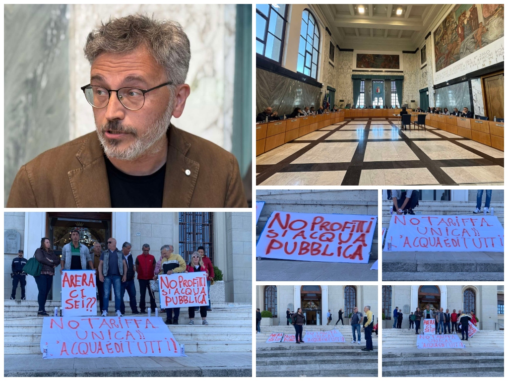 Una dozzina di attivisti hanno fatto un presidio davanti al Palazzo comunale, esponendo striscioni inneggianti all’acqua pubblica e alcuni di loro hanno poi assistito al dibattito in sala consigliare.