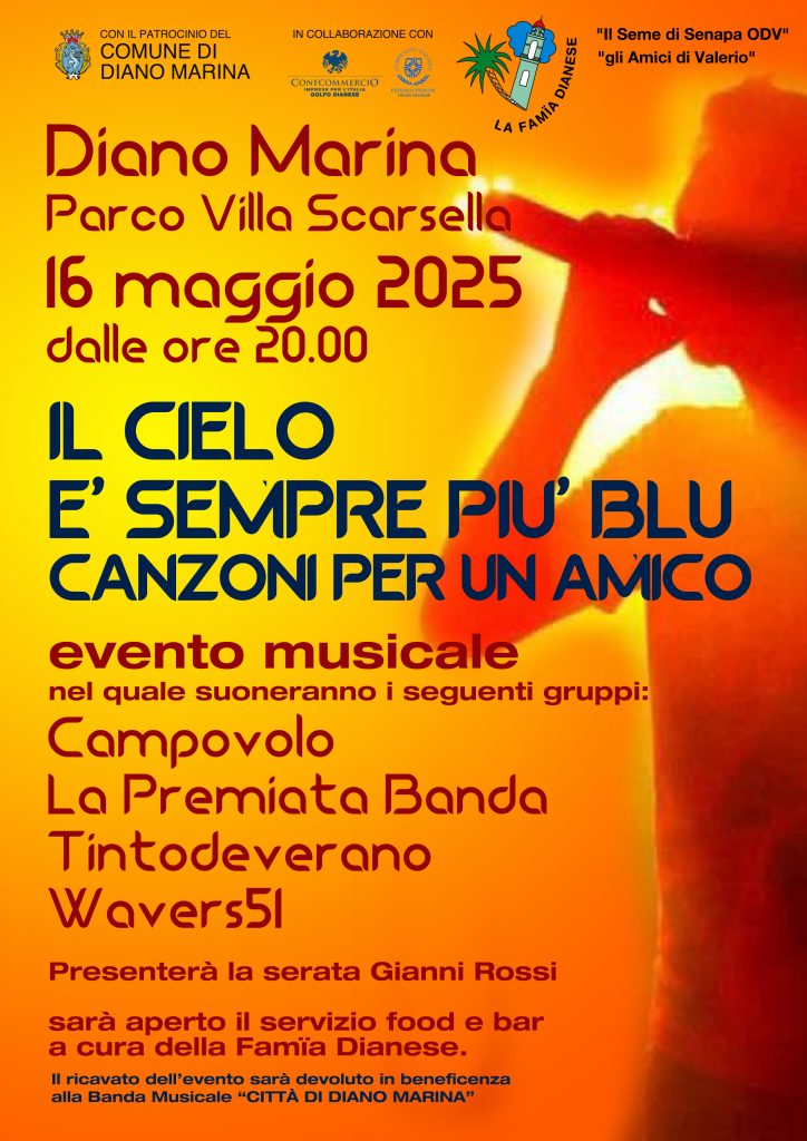 La serata, nella quale la Famia Dianese gestirà gli stand gastronomici ed il bar, avrà una finalità benefica ed i fondi raccolti, per volere della famiglia di Valerio, verranno destinati all’acquisto di strumenti per la scuola di musica della banda “Città di Diano Marina”.