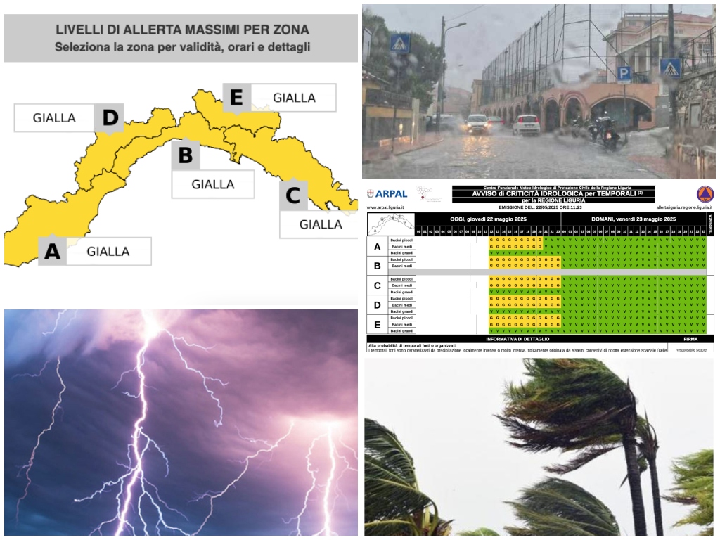 Alla luce delle ultime uscite modellistiche e della situazione in atto, Arpal ha prolungato l’allerta gialla per temporali fino alle 21.00 nella provincia di Imperia (Zona A) e fino alle 23.59 sulle altre zone della Liguria (B-C-D-E) di oggi, giovedì 22 maggio 2025.