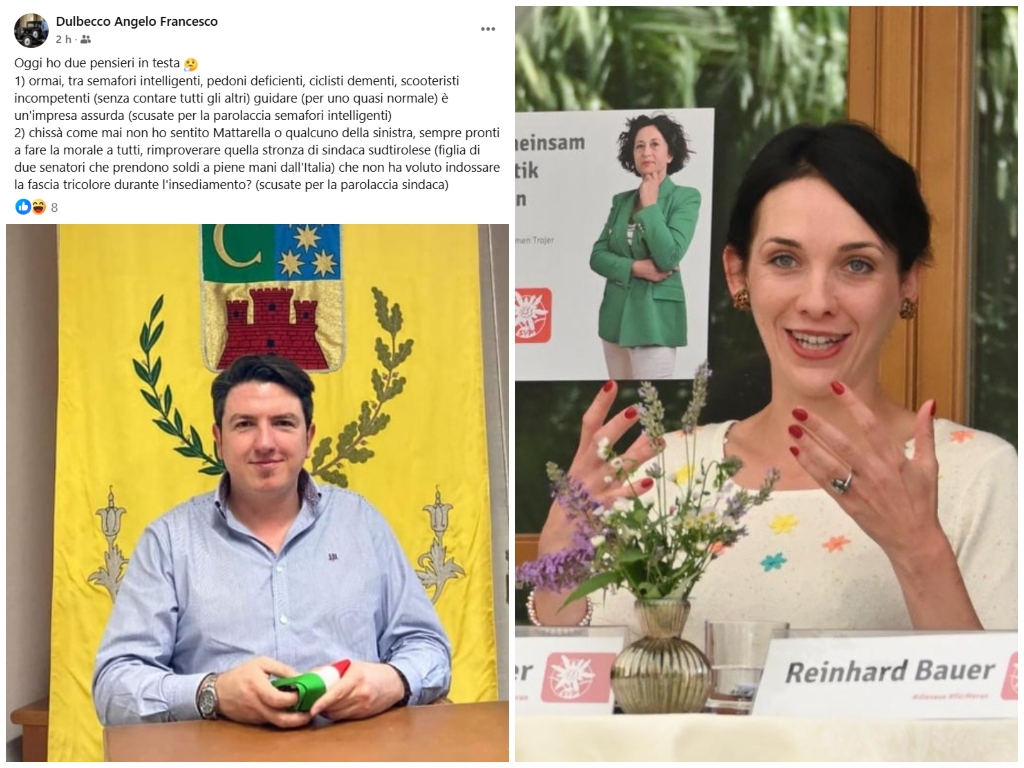 “Quella stronza di sindaca sudtirolese“: parole choc quelle che il sindaco di Caravonica Angelo Francesco Dulbecco ha rivolto nei confronti della collega sindaca di Merano Katharina Zeller in un post condiviso questo pomeriggio sul suo profilo Facebook.