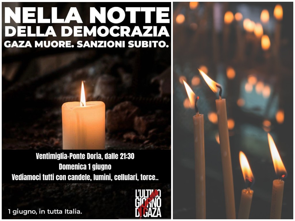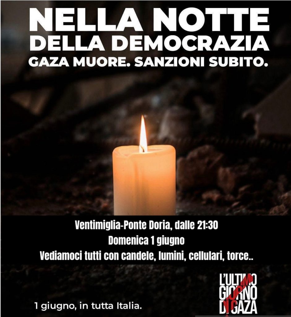 All’interno della campagna nazionale, il Comitato per la Palestina libera invita la cittadinanza e le associazioni tutte a vedersi il 1° giugno, nella notte che precede la Festa della Repubblica, a Ventimiglia, sul Ponte Doria, dalle 21:30, portando candele, torce, lanterne, cellulari accesi.