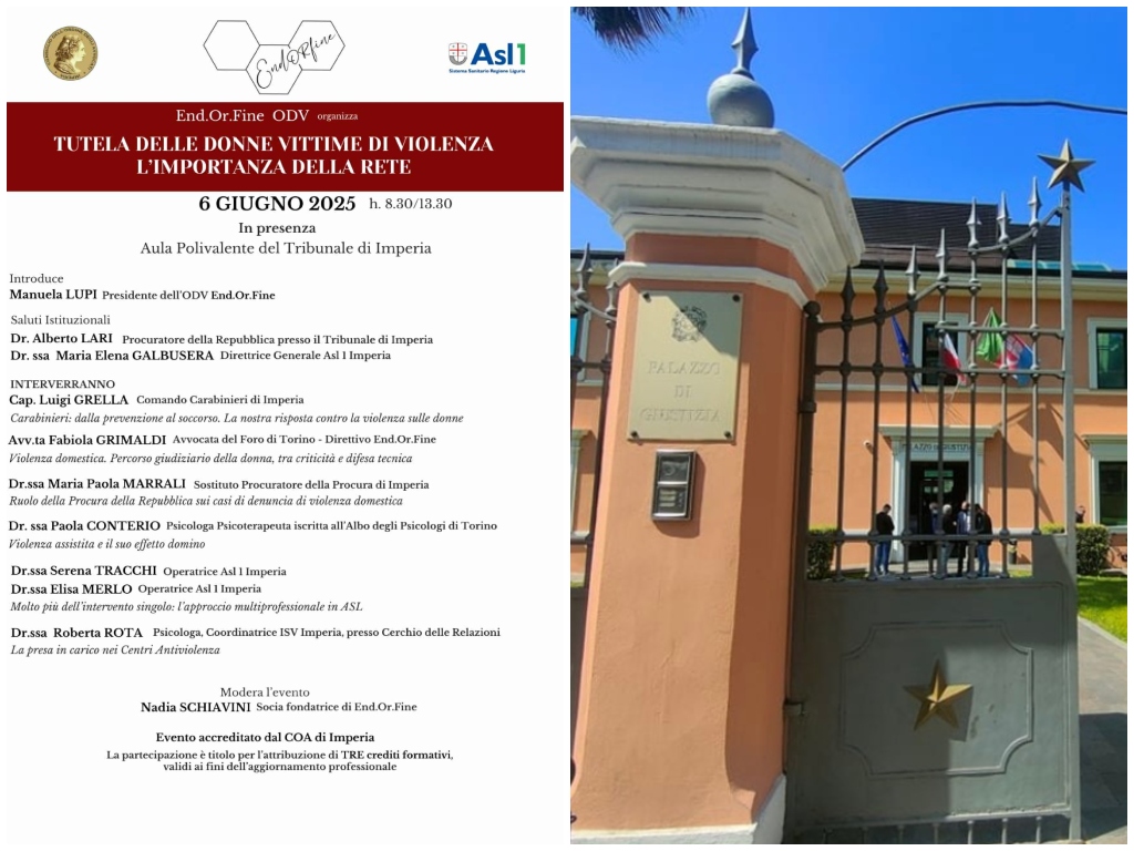 Il prossimo 6 giugno 2025, dalle ore 8.30 alle 13.30, presso l’Aula Polivalente del Tribunale di Imperia, si terrà il convegno dal titolo “Tutela delle donne vittime di violenza – L’importanza della rete“, organizzato dall’associazione End.Or.Fine ODV con il patrocinio dell’ASL 1 Imperiese.