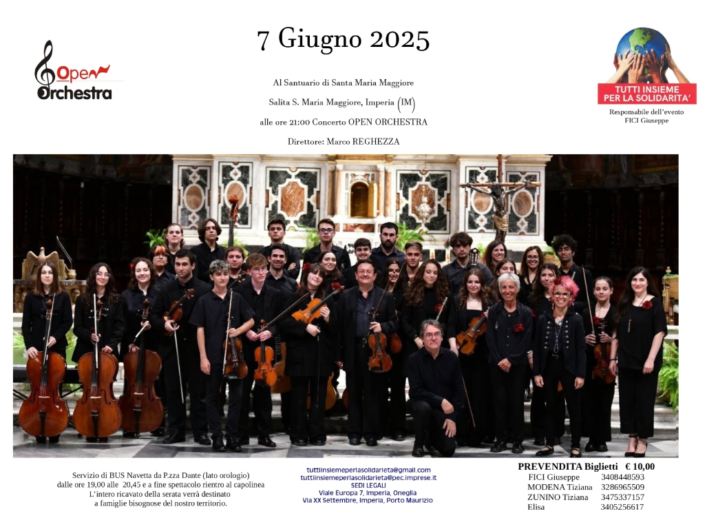 Sabato 7 giugno l’OpenOrchestra terrà uno spettacolo presso il santuario di Santa Maria Maggiore di Imperia alle ore 21:00. L’evento è organizzato dall’associazione “Tutti insieme per la solidarietà” e il ricavato sarà devoluto in beneficenza a favore di famiglie bisognose del nostro territorio.