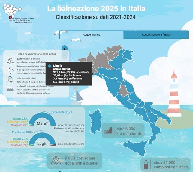 Tutti i dati regionali sono disponibili sul sito Snpambiente.it: https://www.snpambiente.it/snpa/mare-e-laghi-eccellente-oltre-il-95-delle-acque-di-balneazione-italiane/