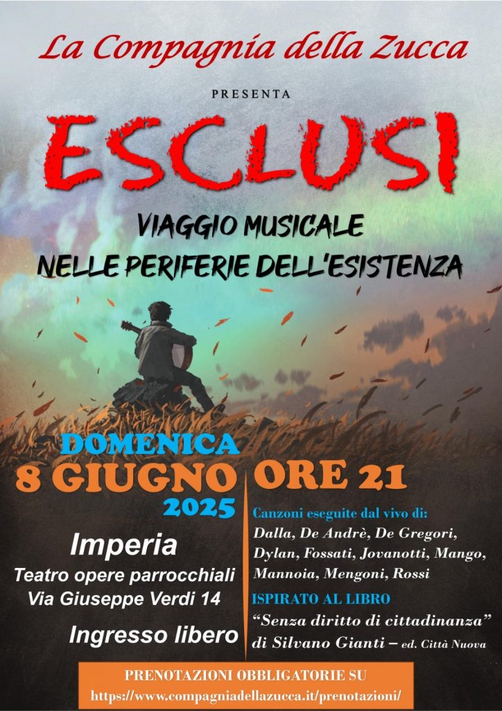 Lo spettacolo “Esclusi. Viaggio musicale nelle periferie dell’esistenza” è una produzione della Compagnia della Zucca, ispirata al libro “Senza diritto di cittadinanza” di Silvano Gianti. Questo lavoro teatrale unisce parole, immagini e musica per dare voce a coloro che vivono ai margini della società, raccontando storie di fragilità e speranza. “Esclusi” si basa su testimonianze reali raccolte da Gianti, focalizzandosi sulle “periferie esistenziali” di città come Genova e Ventimiglia.