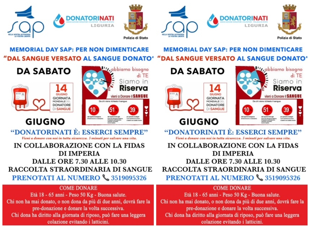 Per tutta la provincia di Imperia, la Segreteria Provinciale SAP e l’Associazione Donatorinati della Polizia di Stato Liguria, in collaborazione conla FIDAS della provincia di Imperia, ha organizzato una settimana di raccolta straordinaria di sangue, nelle sedi di Imperia, Sanremo e Ventimiglia, dal giorno 14 giugno 2025 (giornata mondiale del donatore di sangue) fino al 21 giugno 2025, dal titolo: “ Dal sangue versato al sangue donato”.